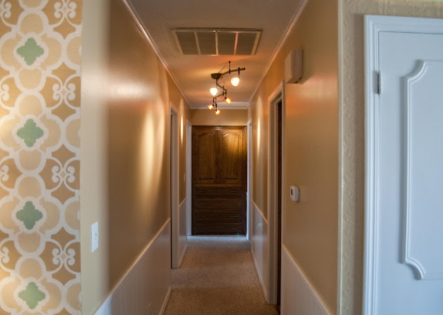 {Up close, you can see that the wall is textured. It's the only wall in the house that's textured like that. When looking at the wall as a whole, the new stencil pattern takes away from the texture, which is kind of nice. I'm not a huge fan of the dated texture technique, and it really stood out when the wall was that ugly red, so the new texture camouflage is very welcomed.}